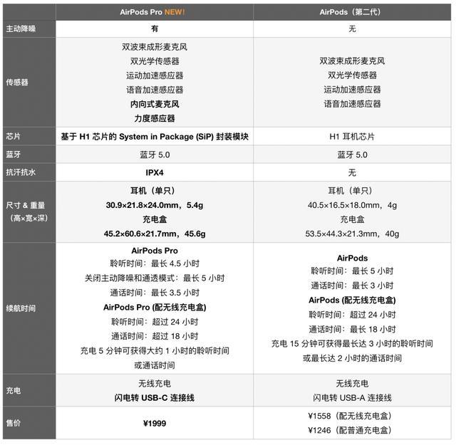 AirPods Pro售价 1999 元,采用入耳式设计,拥有 IPX4 抗汗防水等级,配备主动降噪,支持「通透模式」和「自适应均衡」功能。由于外形的变化和功能的增加,内置的 H1 芯片设计也不同于前代 AirPods,并增加了内向式麦克风和力度传感器,操作手势也比 AirPods 更多。