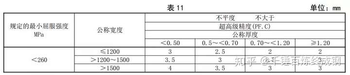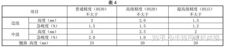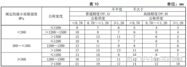 对规定最小屈服强度小于 260MPa 的钢板,当按高级不平度精度或超高级不平度精度供货时,仲裁情况下另需检验边部浪(Edge wave),边部浪应符合以下规定: