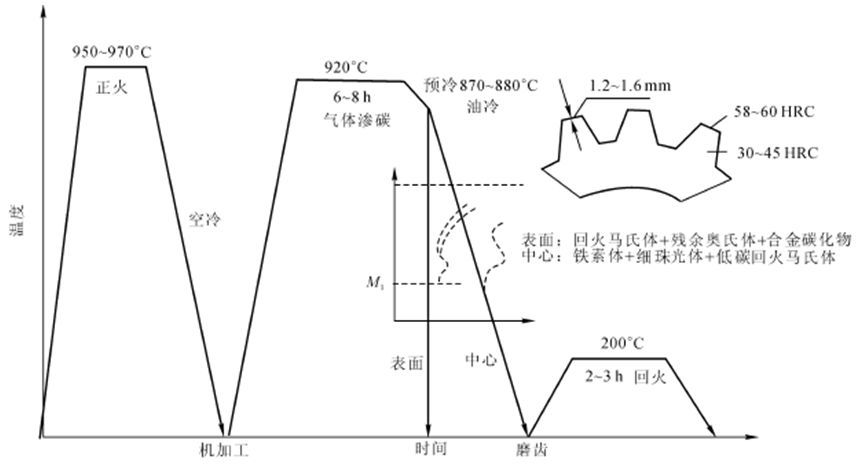 下料锻造正火加工齿形滲碳,预冷淬火+低温回火磨齿。
